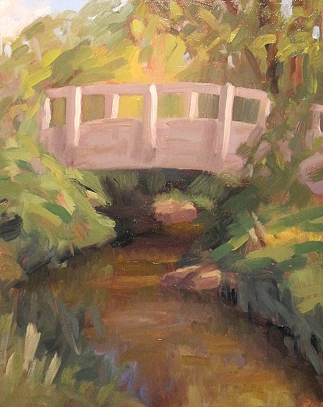 I have been out of commission for a bit, as the graphic art world has been very demanding of my time as of late. I had a free day today, and rushed outside to paint this morning with spring in full bloom. The bridge I painted is very reminiscent of the one that Monet often painted in his garden in Giverny.